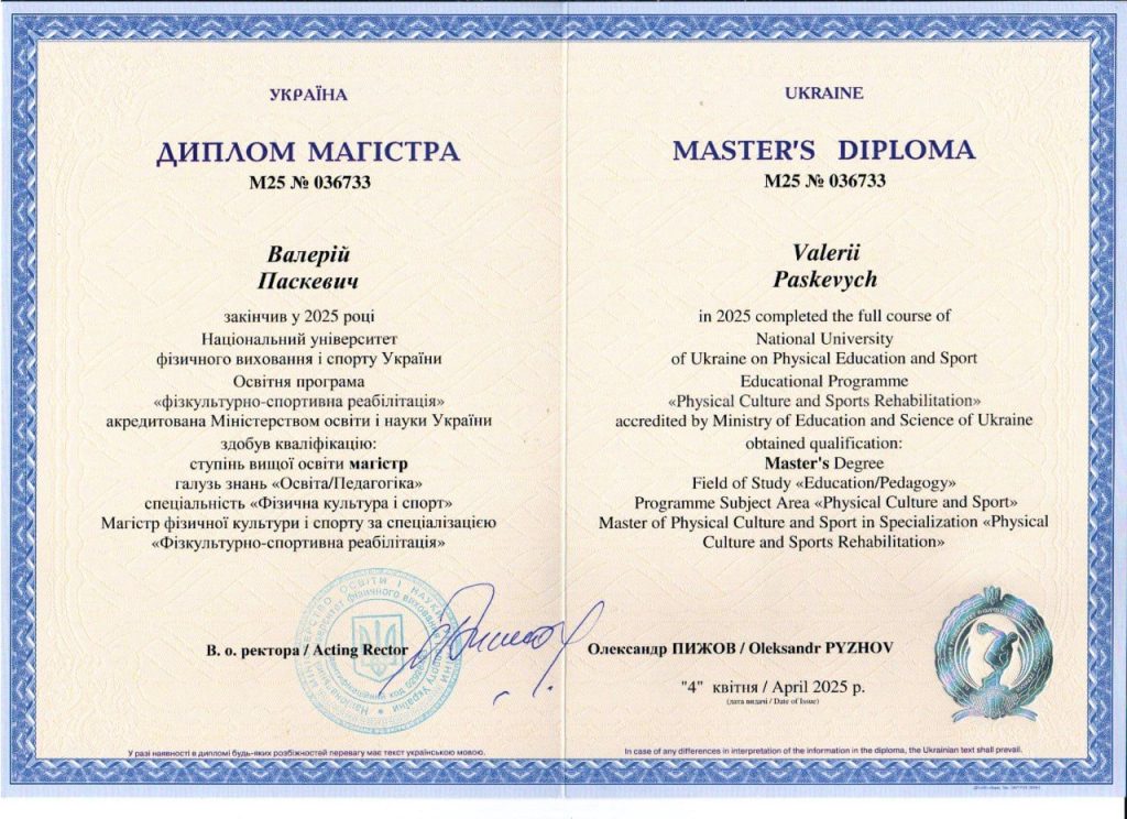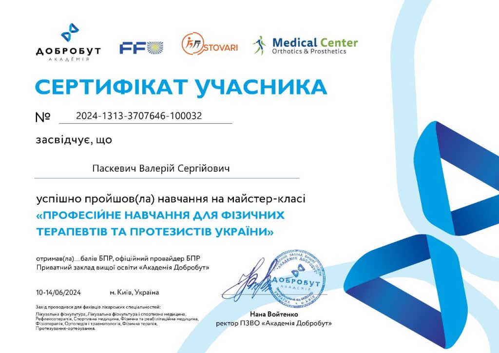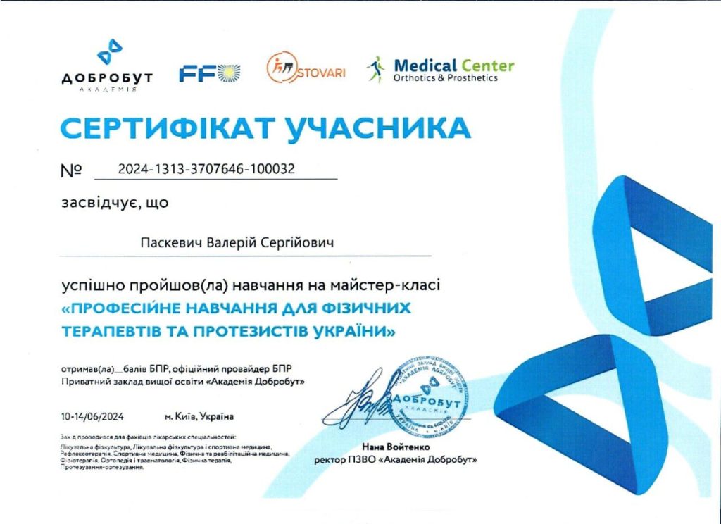 Мене звати Валерій Паскевич. Я реабілітолог із Києва з понад 10-річним досвідом роботи. Займаюсь відновленням рухливості у дітей і дорослих при неврологічних, ортопедичних та післяопераційних станах. Використовую сучасні методики та персональний підхід.